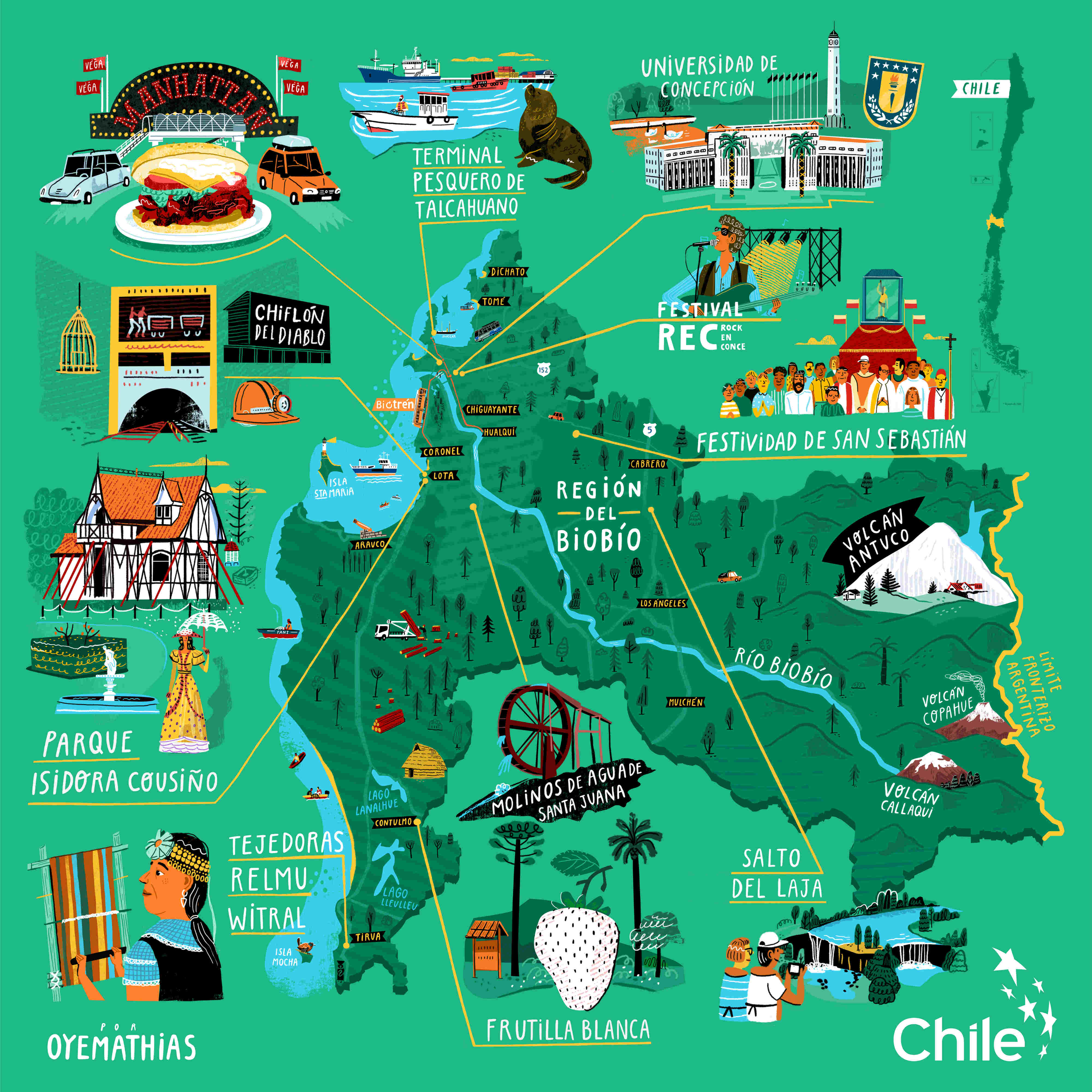 Contará con más de 400m2 y tendrá como principal atractivo: inéditos mapas ilustrados del norte, centro y sur de Chile, los cuales fueron confeccionados por distintos artistas locales, quienes en su estilo creativo, retrataron los paisajes y lugares que los mismos habitantes de las regiones eligieron.