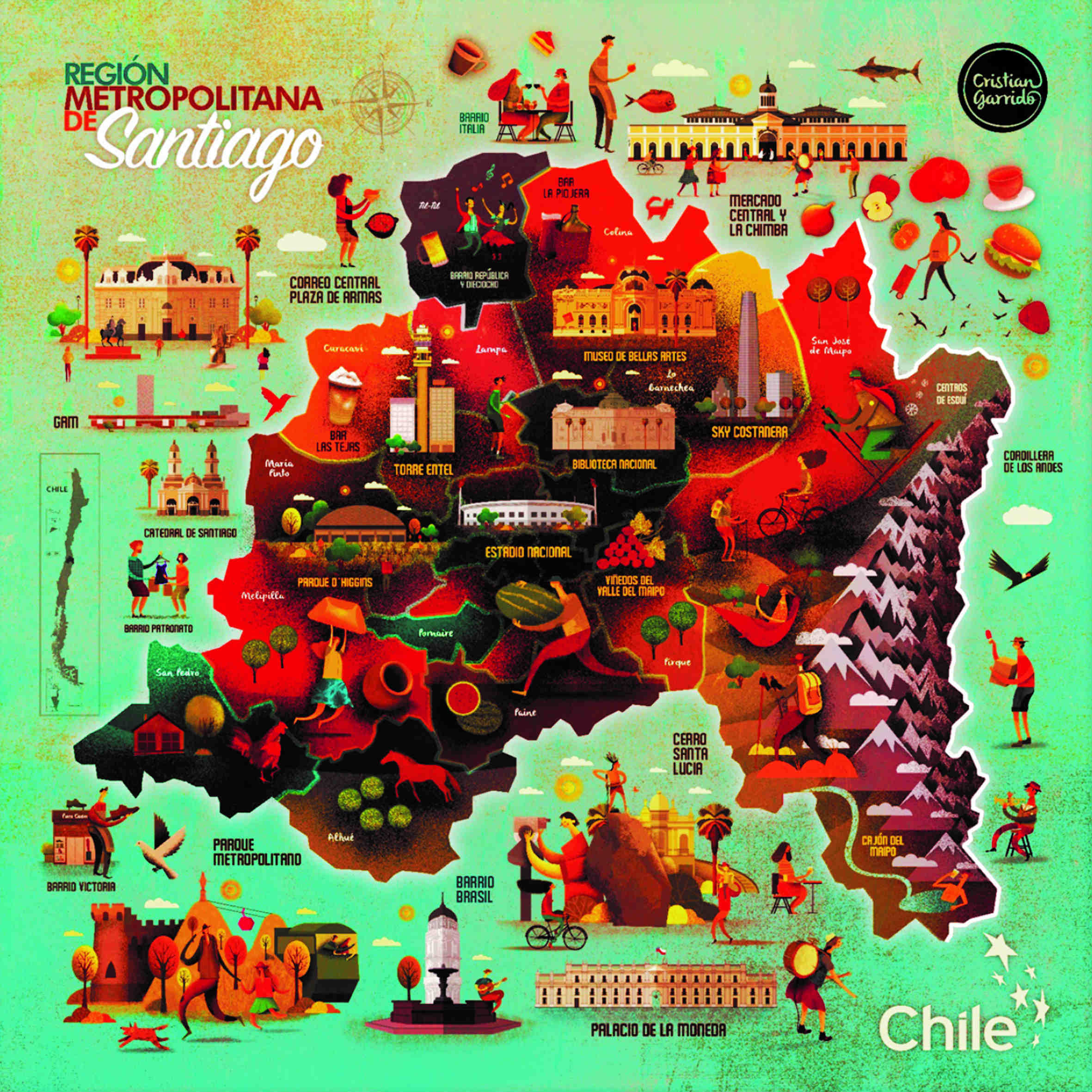 Contará con más de 400m2 y tendrá como principal atractivo: inéditos mapas ilustrados del norte, centro y sur de Chile, los cuales fueron confeccionados por distintos artistas locales, quienes en su estilo creativo, retrataron los paisajes y lugares que los mismos habitantes de las regiones eligieron.