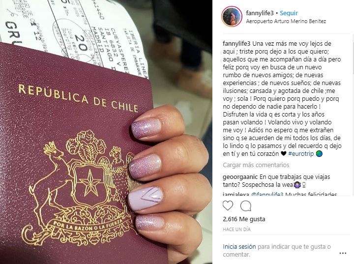"¡Cansada y agotada de Chile me voy sola! Porque quiero, porque puedo y porque no dependo de nadie para hacerlo. Disfruten la vida que es corta y los años pasan volando. ¡Volando vivo y volando me voy!"