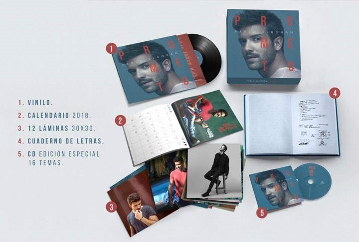Este increíble pack contiene el vinilo de “Prometo”, un calendario 2018, un CD especial de 16 canciones y varias sorpresas para que disfrutes de su música en este mes de Pablo Alborán.