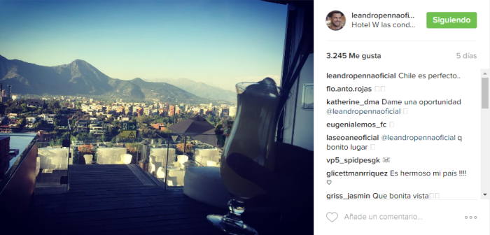 “Chile es perfecto”, escribió junto a una foto donde disfruta de una vista privilegiada de Santiago en el Hotel W de Las Condes.