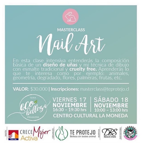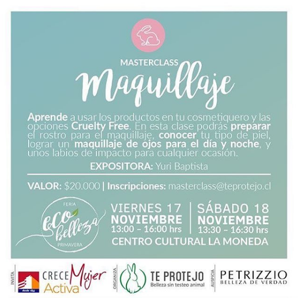 ONG Te Protejo, en el marco de su Feria Ecobelleza, realizará seis masterclass en las temáticas de alimentación vegana, cosmética natural, automaquillaje y nail art para quienes buscan aprender sobre estos temas en el principal evento cruelty free de Chile.