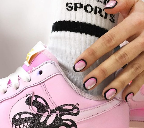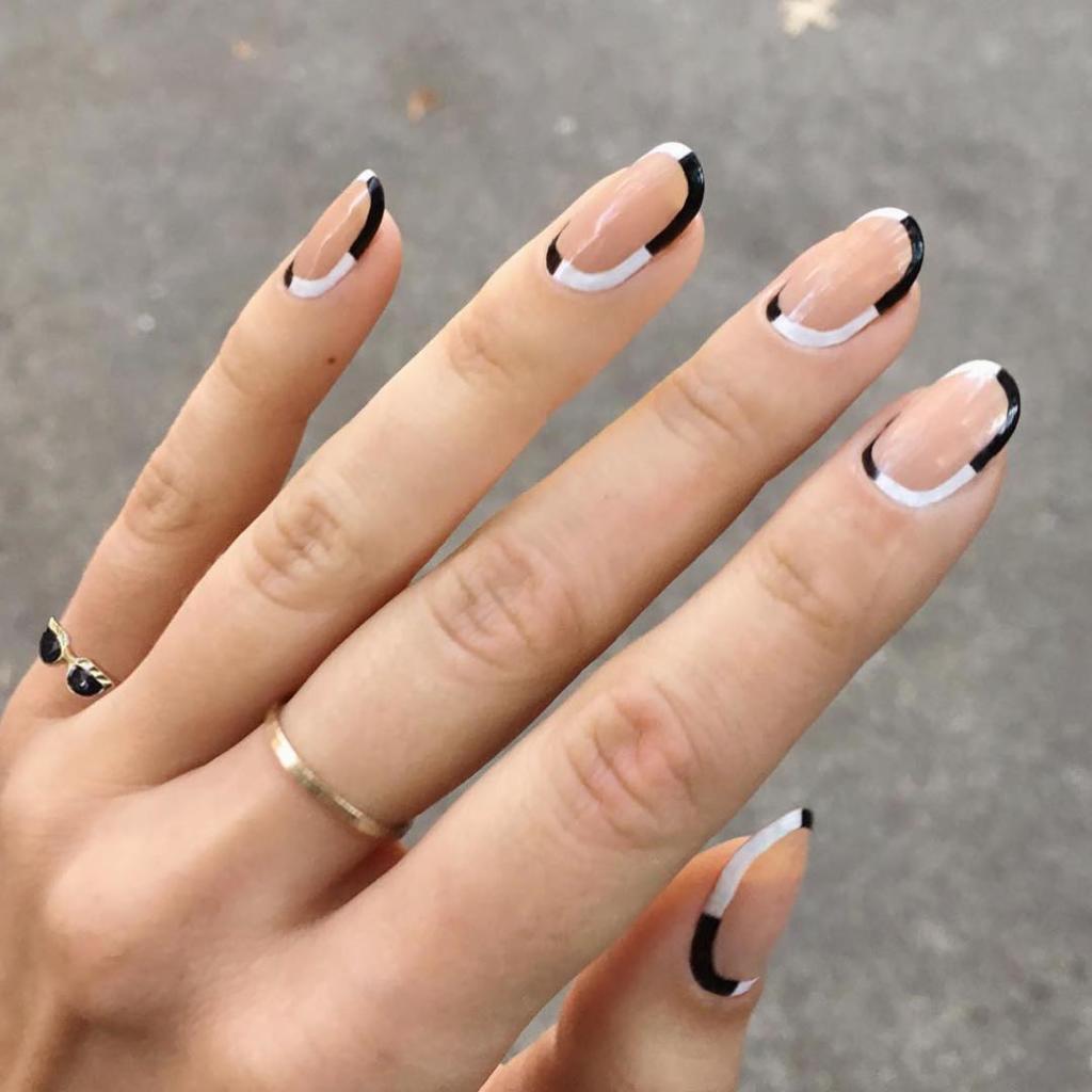 Para una versión sencilla, todo lo que tienes que hacer es pintar una base de color, dejar secar y tomar otro tono para trazar una línea fina en todo el contorno de las uñas.