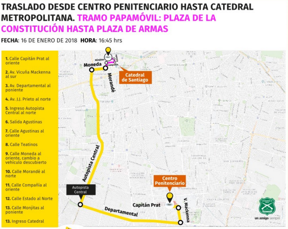 El Santo Padre avanzará en el Papamóvil por Morandé al norte, girando en la Plaza de Armas hasta la entrada de la Catedral Metropolitana.