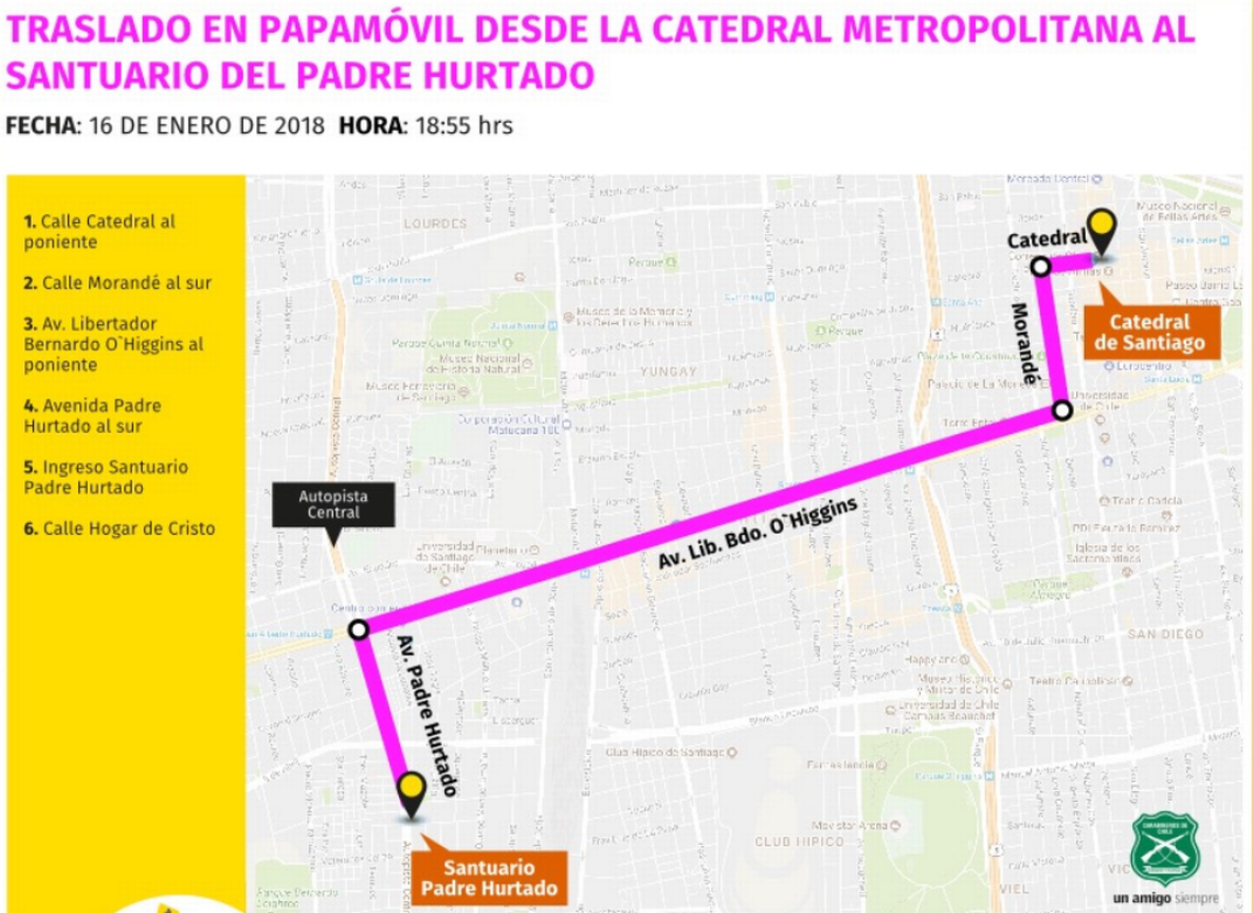 El segundo recorrido será entre las 18:50 y las 19:15 horas y comprenderá el trayecto entre la Catedral de Santiago y el Santuario de Padre Hurtado, en la comuna de Estación Central.