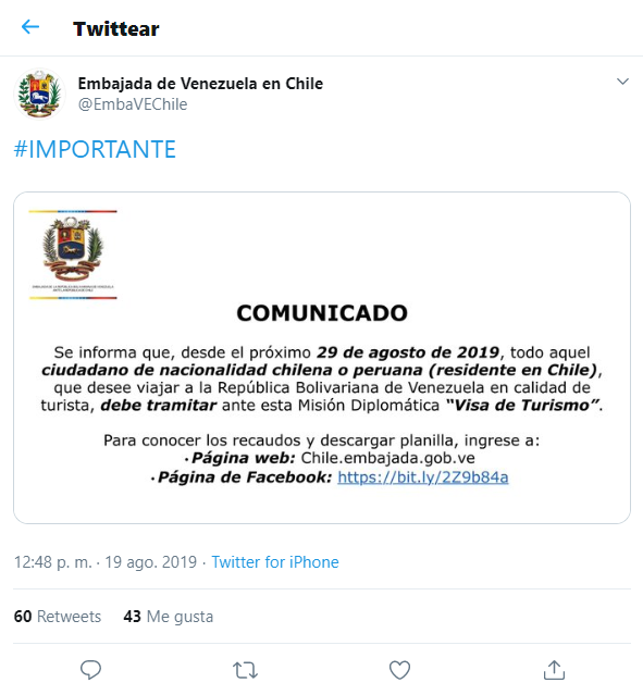 Ahora bien, en el caso de Venezuela, aunque Chile Atiende haya confirmado que se puede entrar con cédula de identidad, esto cambió. En agosto del 2019, la embajada venezolana lanzó un comunicado donde señalaban que a partir de ese momento era necesario contar con visa para entrar al país.