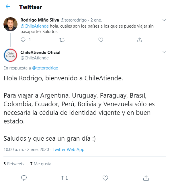 Así lo aclaró el organismo ChileAtiende luego de que un hombre llamado 'Rodrigo' les preguntará por Twitter '¿a qué países podía viajar sin pasaporte?'. Ellos respondieron que "para viajar a Argentina, Uruguay, Paraguay, Brasil, Colombia, Ecuador, Perú, Bolivia y Venezuela sólo es necesaria la cédula de identidad vigente y en buen estado...".