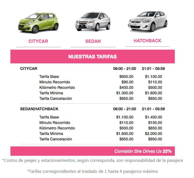 "She drives us", que operará en celulares con IOS y Andriod, tendrá dos tarifas base que dependen de los horarios: la primera desde las 06:00 hasta las 21:00 horas, con un valor de $850, y la segunda desde las 21:01 hasta las 05:59 horas, con n valor de $1.100.