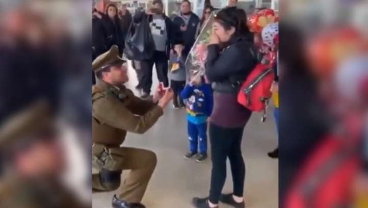 El pasado sábado, un carabinero llegó hasta el terminal San Borja, de Santiago, con el objetivo de pedir matrimonio a su novia. Esta situación, fue grabada por quienes estaban presentes en el terminal, y ha emocionado a muchos a través de redes sociales.