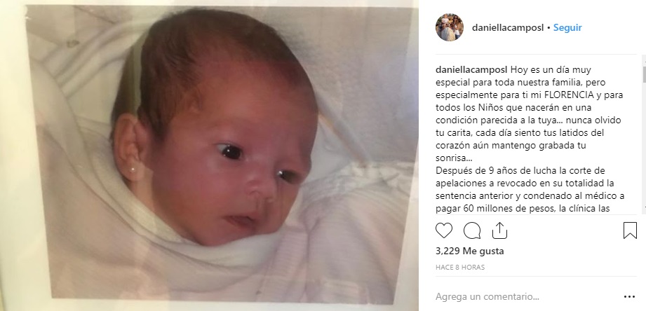 Luego añadió: “Después de 9 años de lucha la corte de apelaciones ha revocado en su totalidad la sentencia anterior y condenado al médico a pagar 60 millones de pesos, la Clínica Llas Condes alegó prescripción por haber sido mal notificados. No importa, seguiremos en la lucha hasta el final. Gracias hija por ayudarme a no bajar los brazos, gracias a mi familia y mi marido quienes no se movieron de nuestro lado… gracias a mi angelito Florencia”.