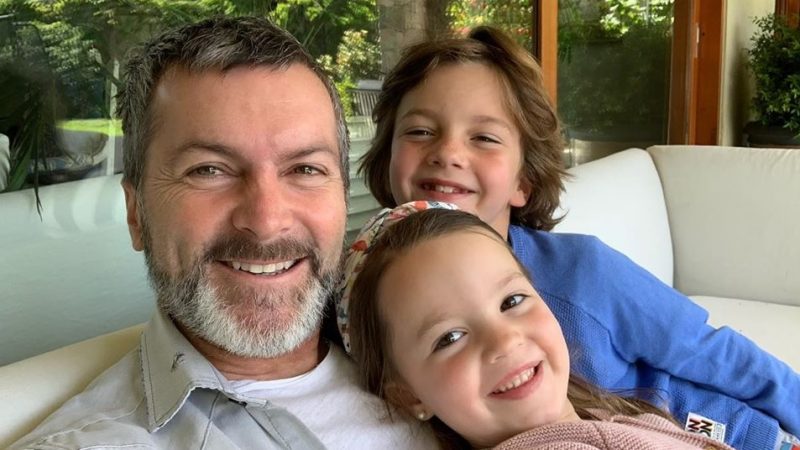 En la imagen, se puede ver al animador arreglando el motor de un auto junto a su hijo Facundo. Por otro lado, se observa a su hija Gracia escribiendo en una libreta rosada y con un coche con una muñeca.