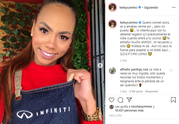 'Quiero sonreír porque sé que amabas verme así... pero no puedo... Lo intento. Aquí con tu delantal regalón que prácticamente te robé cuando entré a tu cocina. Te extraño mucho AMIGO. Me recuerdo y solo tristeza me da. Aun no saco la fuerza para aceptar que no estás aquí... Q.D.E.P CIRO (cirito)', escribió la modelo y bailarina.