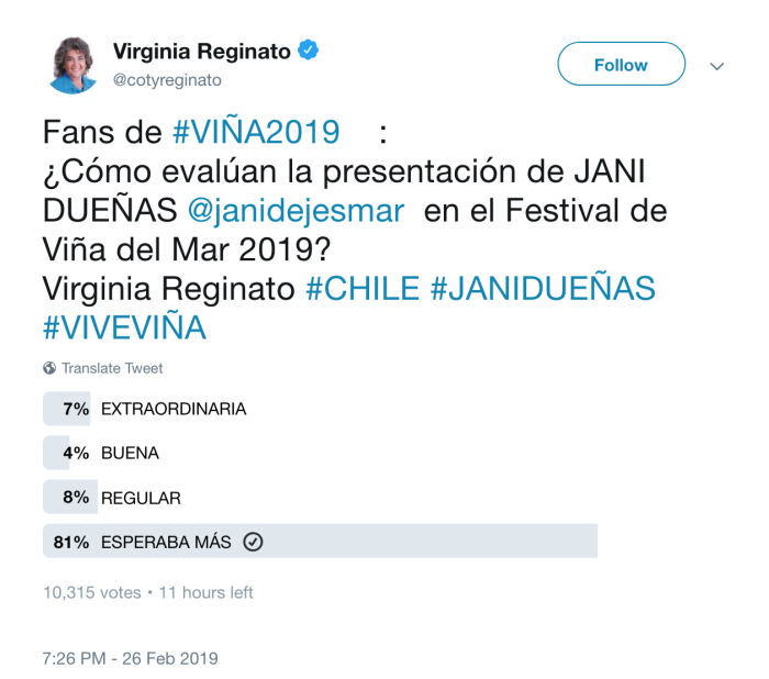 "¿Cómo evalúan la presentación de JANI DUEÑAS @janidejesmar en el Festival de Viña del Mar 2019?", escribió Reginato, agregando las opciones: "extraordinaria", "buena", "regular" y "esperaba más".