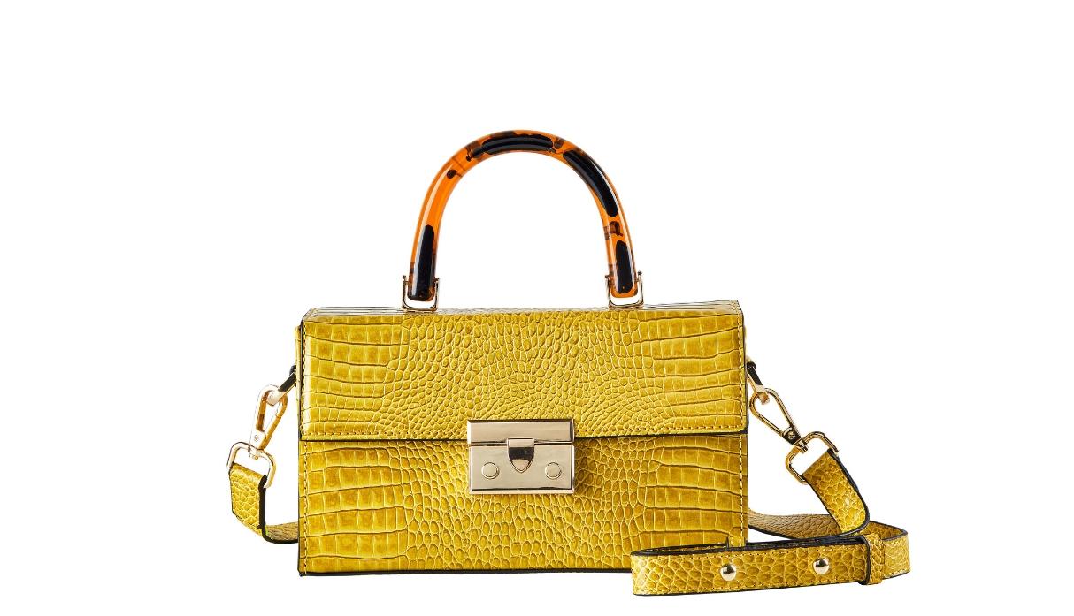 Si quieres brillar, elige tu cartera croc-effect en color amarillo.