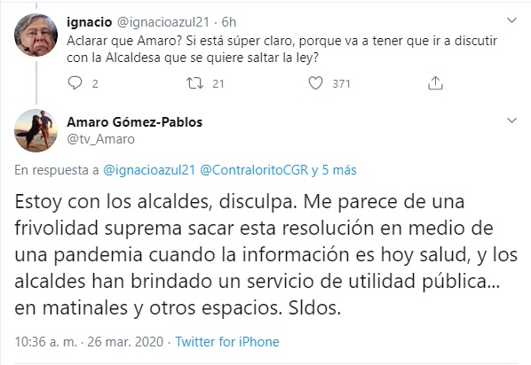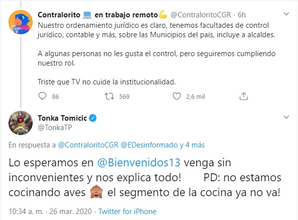 La dupla, con humor, dejaron invitado al contralor al matinal, pero su respuesta no fue bien recibida por la mayoría de los usuarios. Por lo demás, el conductor luego expresó en otro tuit que "estaba con los alcaldes".