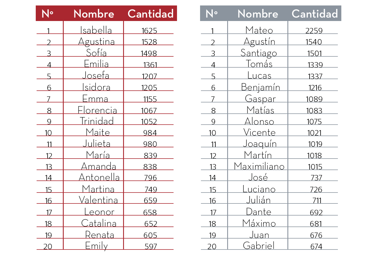 De acuerdo a la publicación, los nombres con más inscripciones fueron Isabella y Mateo. Para Isabella se han hecho 1.625 inscripciones, mientras que para Mateo, 2.259.
