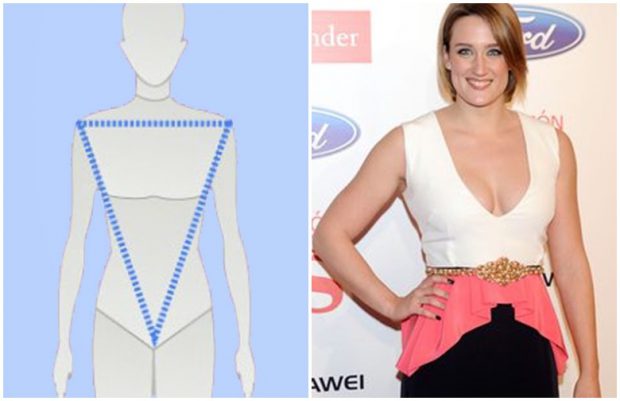 Las personas que tienen "cuerpo triángulo" son aquellas que sus hombros y pecho son más angostos que la cadera. Para balancear las curvas, se debe centrar la atención en los hombros y en el pecho. Además, se debe buscar prendas que permitan resaltar esta parte del cuerpo y que hagan la ilusión visual de reloj de arena.