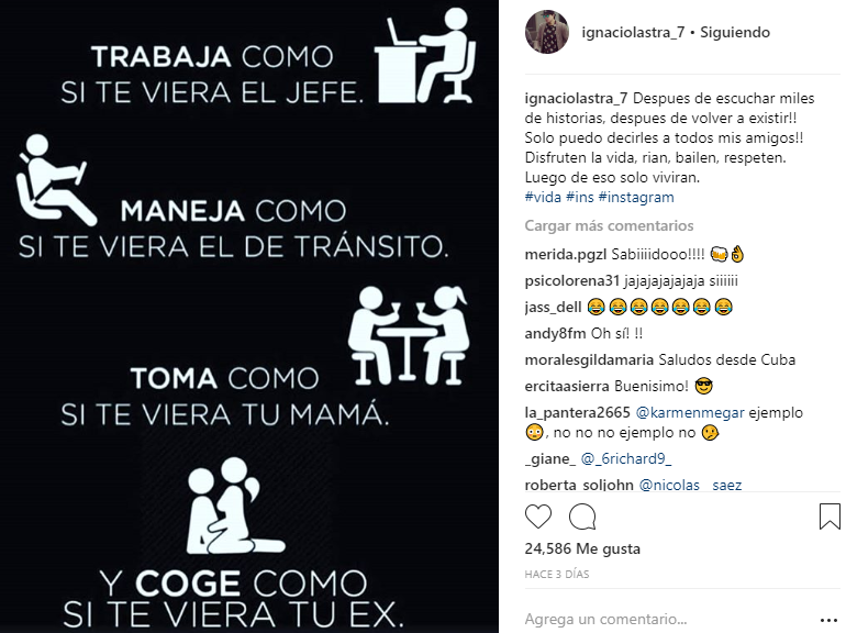 Lo que inquietó un poco a sus seguidores fue que en una de las frases de la imagen publicada aparece que se debe "coger como si te viera tu ex", lo que muchos enseguida relacionaron a su ex Julia Fernández con la que sufrió el accidente y de quien ya lleva un tiempo separado.