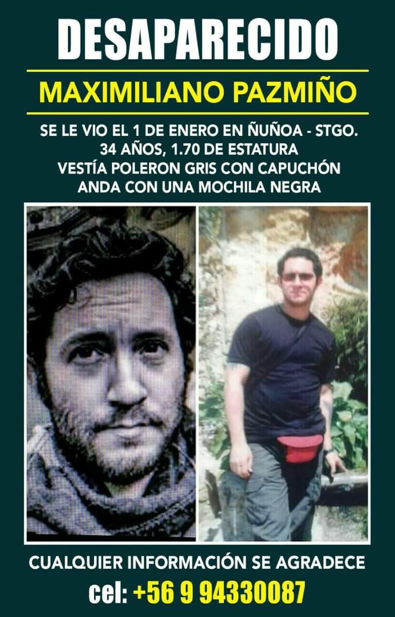 Según informan los medios, Maximiliano de 34 años, y quien es pintor, fue captado por última vez por las cámaras de seguridad del edificio donde vive en la comuna de Ñuñoa junto a su mamá, cuando salía con rumbo desconocido: "Hemos tenido días terrible y lo único que deseamos es que vuelva. Toda la familia y amigos estamos movilizados esperando que regrese", dijo la madre del artista María Antonieta Fernández.