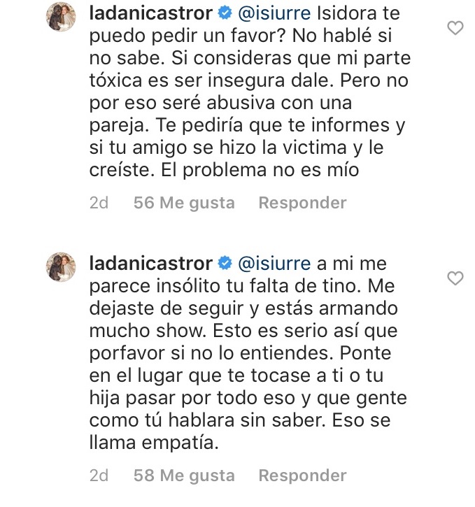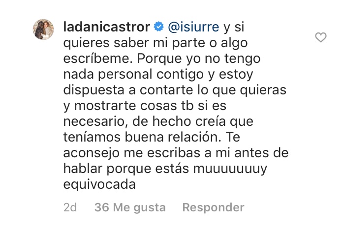 Tras estos mensajes, Daniela comentó en la publicación para responderle a la actriz.