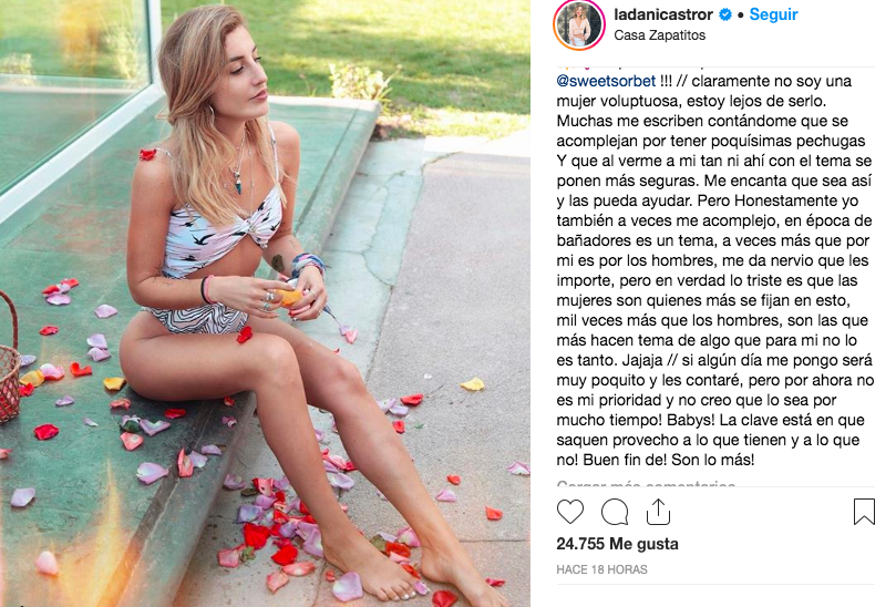 "Claramente no soy una mujer voluptuosa, estoy lejos de serlo. Muchas me escriben contándome que se acomplejan por tener poquísimas pechugas. Y que al verme a mí tan ni ahí con el tema se ponen más seguras. Me encanta que sea así y las pueda ayudar", partió escribiendo.