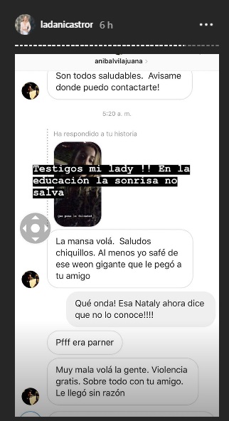 Entre las dudas que le llegaban de sus seguidores, Daniela Castro tomo la captura de un seguidor que le comentó que estaba en la discoteque y que vio la pelea. "Nataly no niegues a tus amigos, estuviste bailando con ellos toda la noche y qué pena negarlos porque causan problemas. Hazte cargo. Parte de ser lady es hacerte cargo", finalizó Daniela.