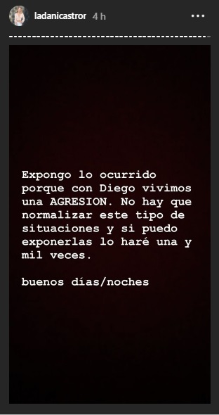 Según las historias en la cuenta de Instagram de Daniela, su amigo sufrió una agresión injustificada de unos desconocidos a los que ella grabó para denunciarlos por redes sociales que, al parecer, eran amigos de la panelista del matinal "Hola Chile".