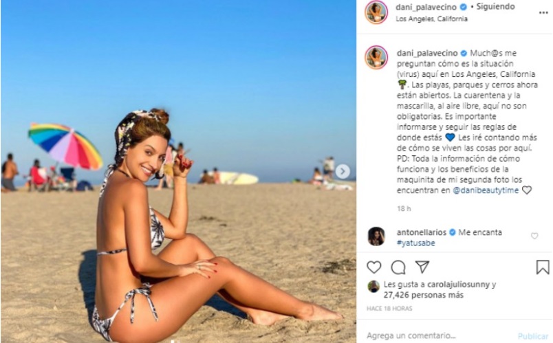 "Much@s me preguntan cómo es la situación (virus) aquí en Los Angeles, California. Las playas, parques y cerros ahora están abiertos. La cuarentena y la mascarilla, al aire libre, aquí no son obligatorias. Es importante informarse y seguir las reglas de donde estás", escribió Palavecino, asegurando que luego contaría más detalles de cómo si viven las cosas por allá.