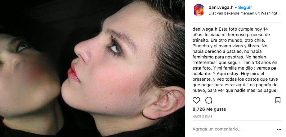 Pero para Daniela no todo ha sido tan fácil, a 14 años de su tránsito, la chilena quiso destacar y recordar con nostalgia por todo lo que tuvo que pasar para llegar a ser una destacada actriz. "Esta foto cumple hoy 14 años. Iniciaba mi hermoso proceso de tránsito. Era otro mundo, otro Chile. Pinocho y el mamo vivos y libres. No había derecho a pataleo, no había feminismo para nosotras”, escribió.