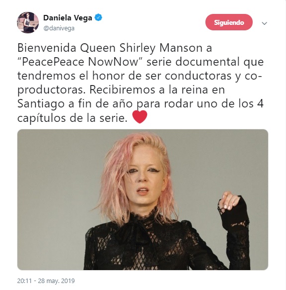 "Bienvenida Queen Shirley Manson a “PeacePeace NowNow”, serie documental que tendremos el honor de ser conductoras y co-productoras. Recibiremos a la reina en Santiago a fin de año para rodar uno de los 4 capítulos de la serie", escribió la actriz.