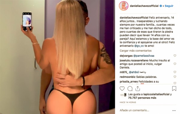“Feliz aniversario. 14 años juntos… Inseparables y luchando siempre por nuestra familia… ¿Cuántas veces me han criticado y me han dicho de todo, pero cuántas de esas que tiraron la piedra pueden decir que llevan 14 años con su pareja? Aquí estamos y la base del amor es la confianza ¡¡y el apoyarse uno al otro!! Feliz aniversario @gv_cc ¡te amo!”, escribió Chávez en la publicación.