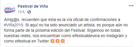 Por otro parte, si bien han surgido varios nombres de posibles artistas confirmados, la organización del festival, que estará a cargo de Martín Cárcamo y María Luisa Godoy, insistió en que hasta ahora no hay nada cerrado.