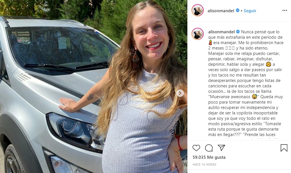 Sin embargo, el esperado momento aún no llega y Alison sigue disfrutando de los últimos días de su embarazo. En ese contexto, este domingo la rubia compartió una publicación en Instagram donde cuenta que una de las cosas que más extraña en este proceso es manejar, pues se lo prohibieron hace dos meses.