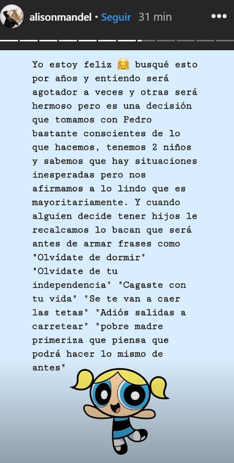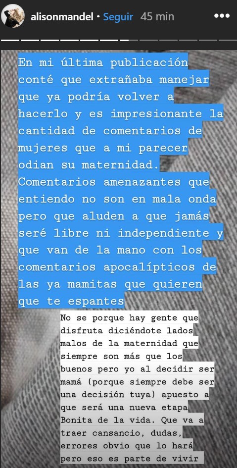 "Es impresionante la cantidad de comentarios de mujeres que a mi parecer odian su maternidad. Comentarios amenazantes que entiendo no son en mala onda, pero que aluden a que jamás seré libre ni independiente", comentó.