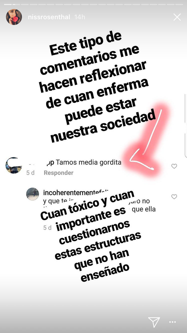 Ante ese mensaje y otros que recibió, la artista respondió a través de una serie de videos por esta red social, donde expresó su opinión frente al tema y se descargó ante las constantes críticas al físico, especialmente en el caso de las mujeres. "¿Qué es que esté "media gordita"?, ¿qué estoy sana?, ¿que no estoy como con un cuerpo enfermo? (...) Hace tiempo que tenía ganas de hablar de esto. Chiquillos reflexionemos, cuestionémonos, cuáles son esas estructuras, cuáles son las cosas que nos han hecho creer de por vida que están bien o están mal", empezó su relato.