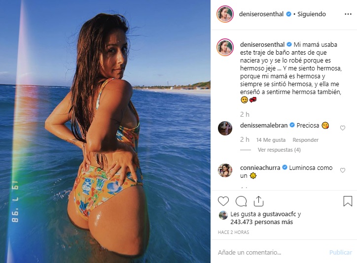 'Mi mamá usaba este traje de baño antes de que naciera yo y se lo robé porque es hermoso jeje .. Y me siento hermosa, porque mi mamá es hermosa y siempre se sintió hermosa, y ella me enseñó a sentirme hermosa también 😏💞', escribió Denise para acompañar la instantánea.
