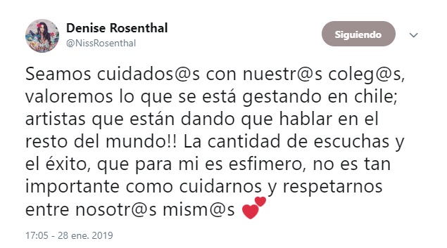 Finalmente, la cantante cerró el tema con un mensaje de tono conciliador, señalando que "la cantidad de escuchas y el exito, que para mí es efímero, no es tan importante como cuidarnos y respetarnos entre nosotr@s mism@s".