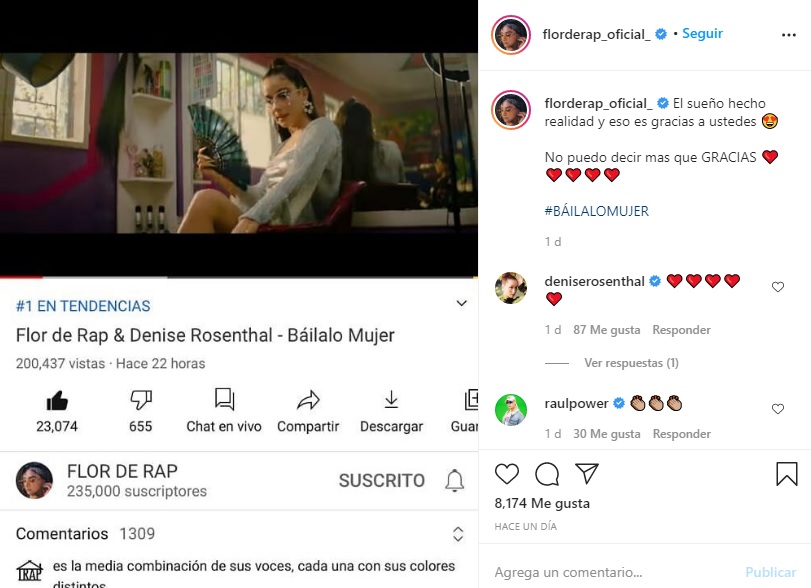 A través de su Instagram, Flor de Rap celebró la noticia y publicó la foto donde se veía que era número uno en tendencia. Quiso agradecer a sus seguidores y escribió: “el sueño hecho realidad y eso gracias a ustedes. No puedo decir más gracias”.