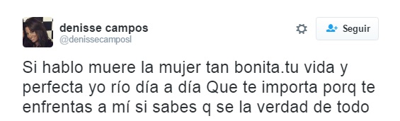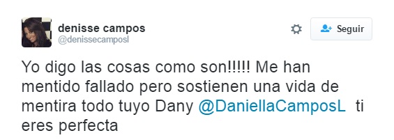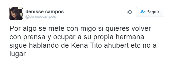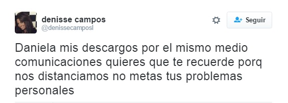 Denisse publicó varios confusos tweets en los que deja ver que algo grave provocó el quiebre de la relación con su hermana. "Daniela mis descargos por el mismo medio comunicaciones quieres que te recuerde porque nos distanciamos no metas tus problemas personales", fue uno de sus descargos.