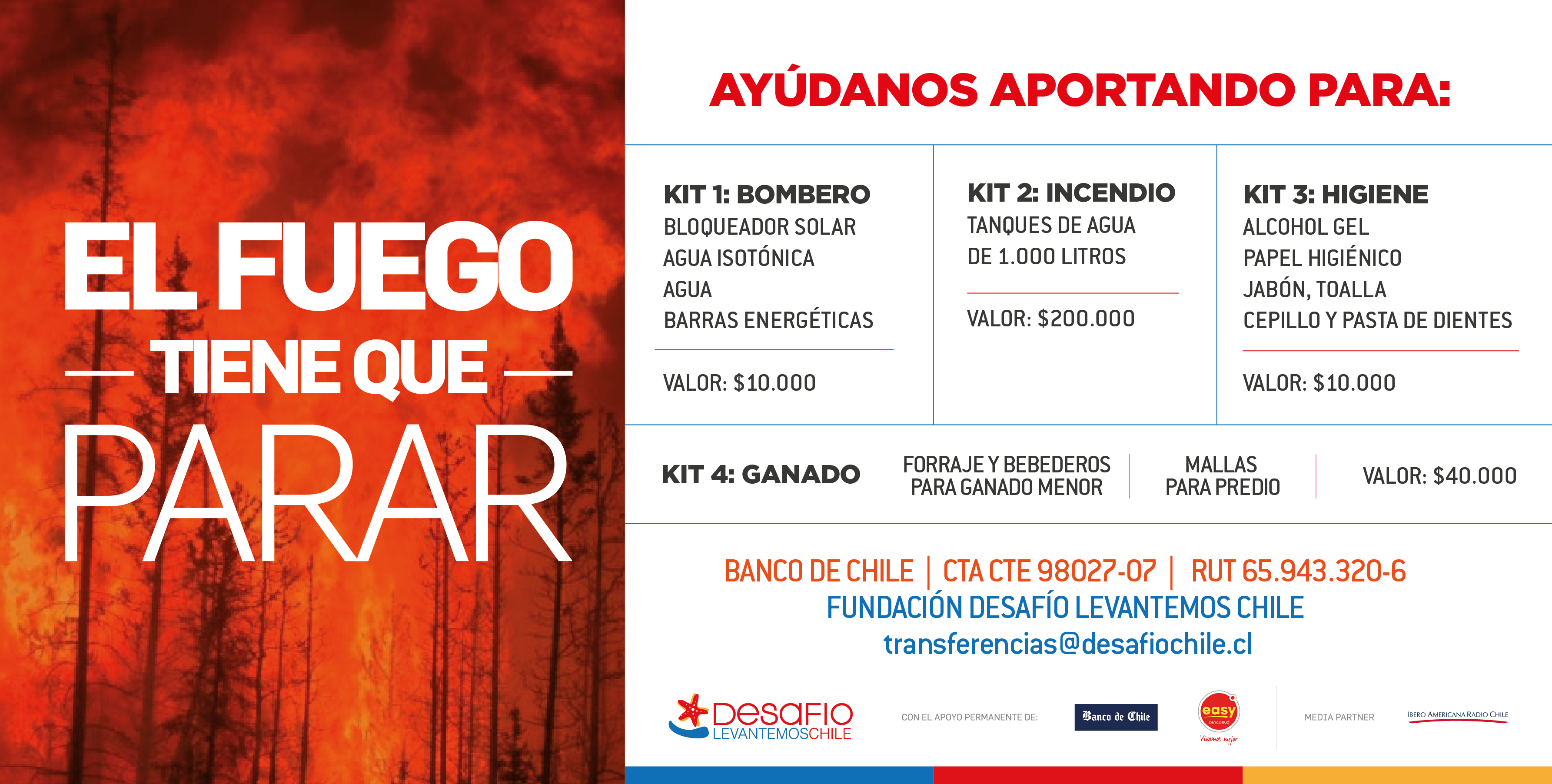 Quienes quieran ayudar podrán hacerlo en www.desafiolevantemoschile.cl aportando en uno de los cuatro kits dispuestos en la campaña, que van desde los 10 mil pesos y hasta los 200 mil, pero también se puede hacer de forma parcial, de manera totalmente voluntaria.