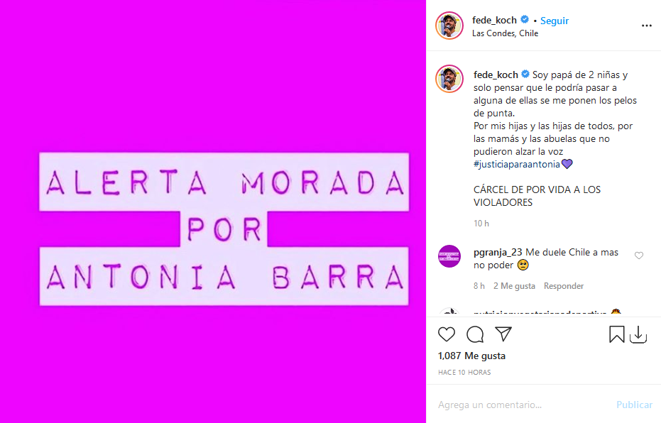 Mientras que Federico expresó: "Soy papá de 2 niñas y solo pensar que le podría pasar a alguna de ellas se me ponen los pelos de punta. Por mis hijas y las hijas de todos, por las mamás y las abuelas que no pudieron alzar la voz #justiciaparaantonia💜 CÁRCEL DE POR VIDA A LOS VIOLADORES".