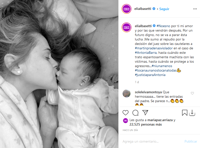 Eliana Albasetti compartió una imagen junto a su recién nacida Luján, que acompañó con el texto: "#Noesno por ti mi amor y por las que vendrán después. Por un futuro digno, no se va a parar esta lucha .Me sumo al repudio por la decisión del juez sobre las cautelares a #martinpradenasviolador en el caso de #AntoniaBarra, hasta cuándo este trato espantosamente machista con las víctimas, hasta cuándo se protege a los agresores...#niunamenos #tocanaunanostocanatodas💪#justiciaparaAntonia".