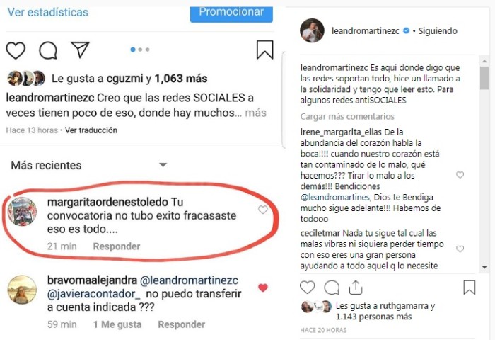 No obstante, Leandro recibió un mensaje que lo decepcionó bastante y no dudó en expresarlo. “Tu convocatoria no tuvo éxito. Fracasaste, eso es todo”, le comentó una mujer, ante lo cual Martínez agregó: “Es aquí donde digo que las redes soportan todo, hice un llamado a la solidaridad y tengo que leer esto. Para algunos redes ‘antisociales’”.