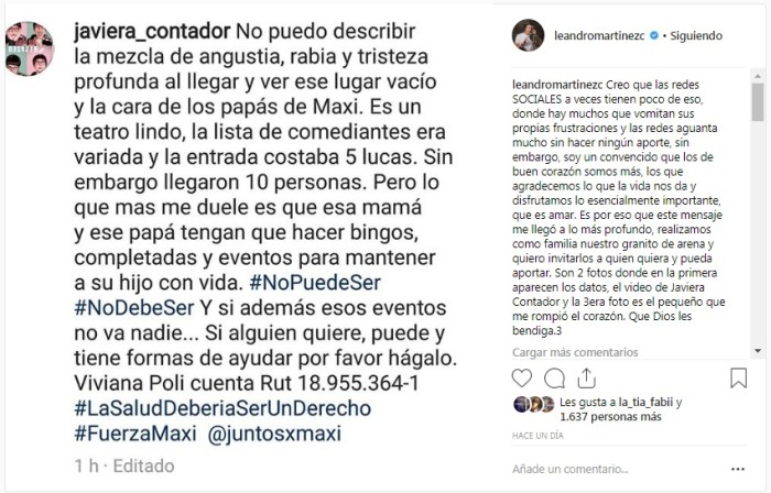 La actriz Javiera Contador vivió una lamentable situación al organizar un evento a beneficio para el pequeño Máximo Contreras. Una de las personas que empatizó con ella fue Leandro Martínez.