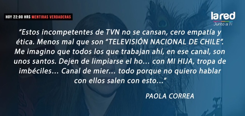 "Estos incompetentes de TVN no se cansan, cero empatía y ética. Menos mal que son ‘Televisión Nacional de Chile’. Me imagino que todos los que trabajan ahí, en ese canal, son unos santos", parte escribiendo Correa, según recogió el matinal "Hola Chile".