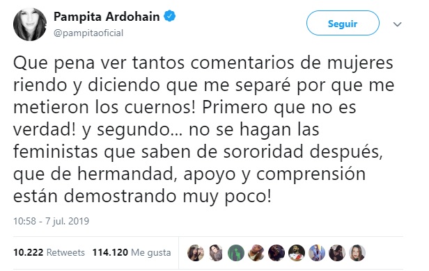 Pampita no se quedó callada tras estos comentarios y publicó un tajante mensaje en su cuenta de Twitter. "No se hagan las feministas que saben de sororidad después, que de hermandad, apoyo y comprensión están demostrando muy poco", declaró.