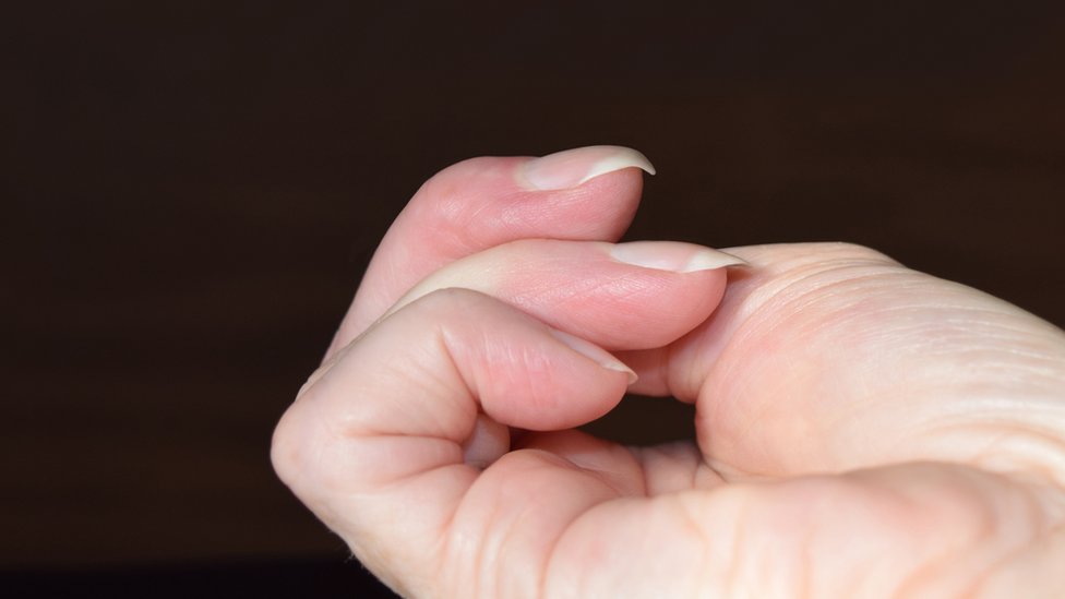Este es uno de los síntomas conocidos desde hace más tiempo. Las uñas se curvan, se vuelven más gruesas y más anchas. Suele ocurrir en todos los dedos de las dos manos.