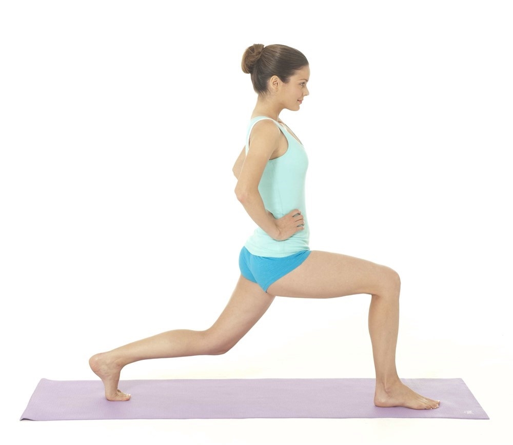 Adoptaremos la misma posición inicial que en la sentadilla. Desde ese punto inicial realizaremos una zancada hacia delante, mientras flexionamos las piernas, manteniendo una angulación máxima en ambas de 90 grados. Sin apoyar la rodilla en el suelo, realizaremos el movimiento contrario recuperando la posición inicial.