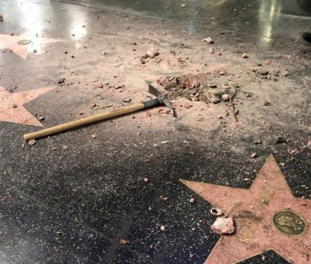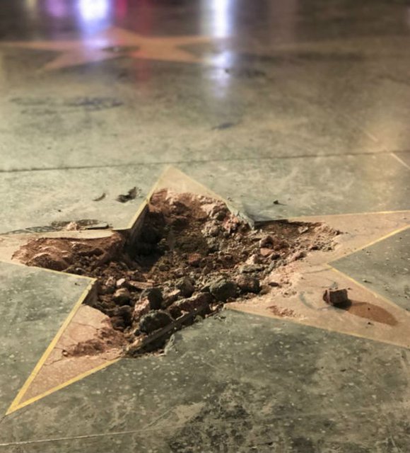Los fotógrafos de prensa corrieron a inmortalizar el atentado simbólico contra el nombre del controvertido mandatario, que tenía su reconocimiento en el paseo de Hollywood desde 2007.