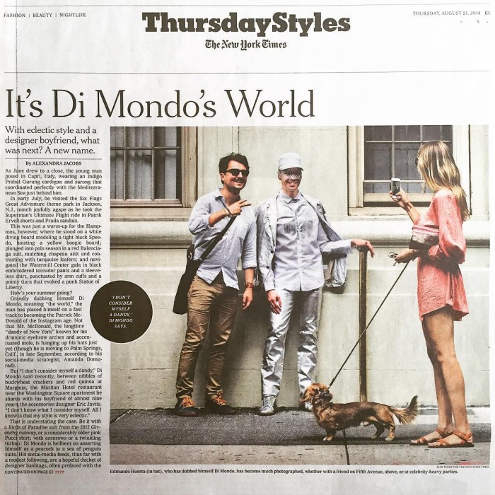 Fue gracias a su participación en un importante evento en Estados Unidos, que su nombre apareció por primera vez en un medio nacional: “Por esa gala me hicieron un artículo en la portada del New York Times en la sección de moda, era fuerte. El título lo puso la periodista, que era ‘It’s Di Mondo’s World'”.